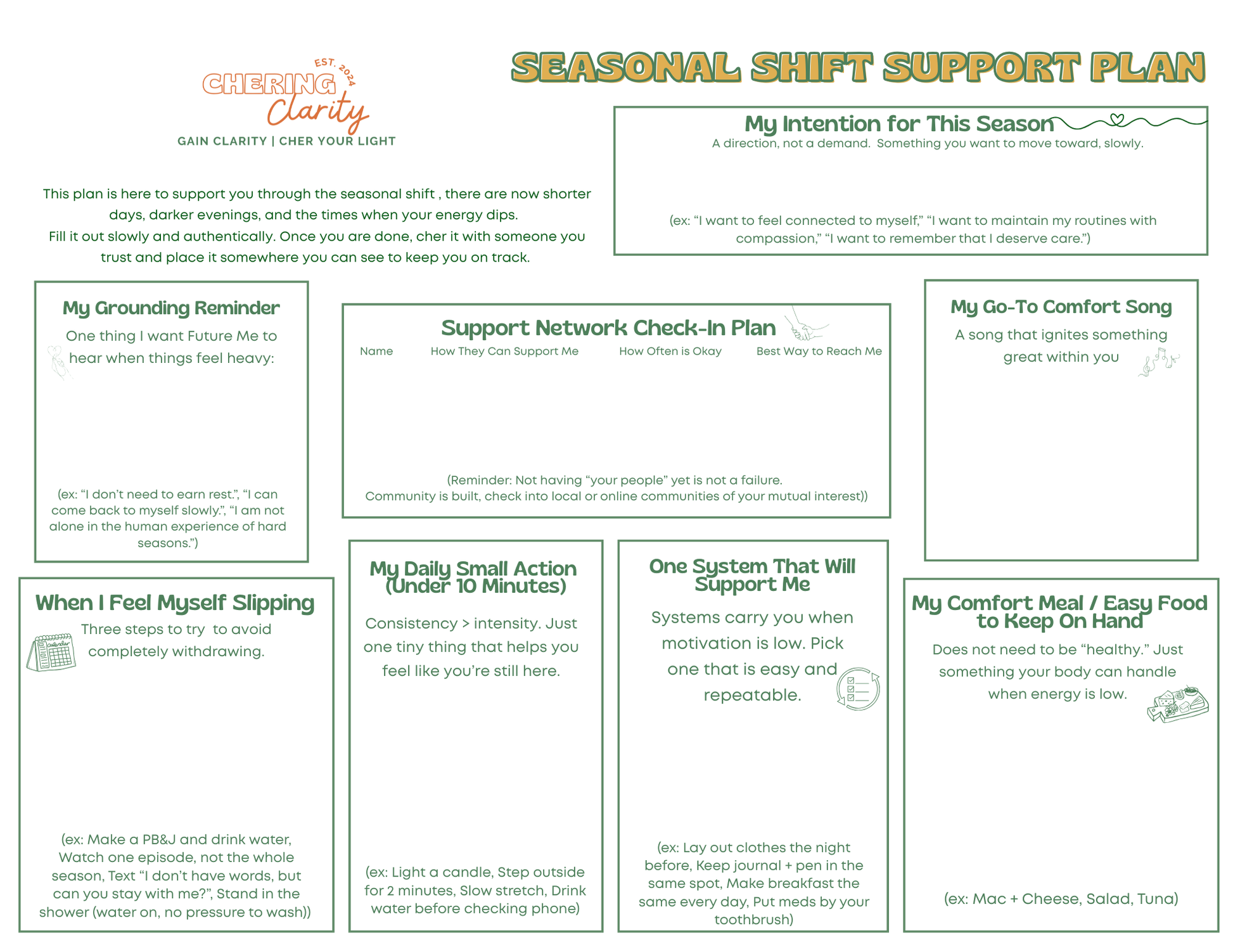 This free worksheet is designed to help you navigate shorter days, darker evenings, and dips in energy. Fill it out slowly and authentically. Once complete, Cher it with someone you trust and place it somewhere visible to keep yourself on track.